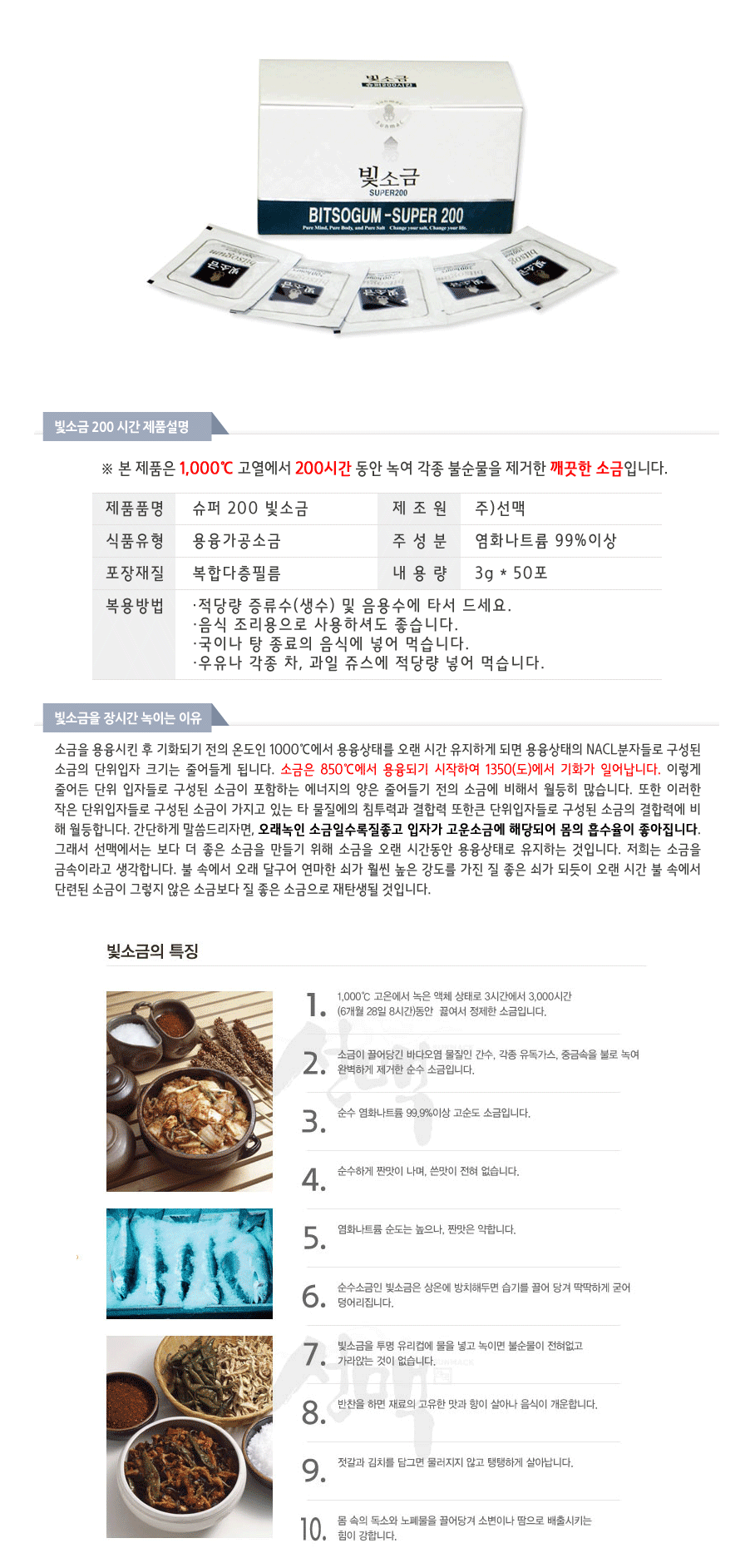 : 본 제품은 1,000도씨 고열에서 200시간 동안 녹여 각종 불순물을 제거한 깨끗한 소금입니다.