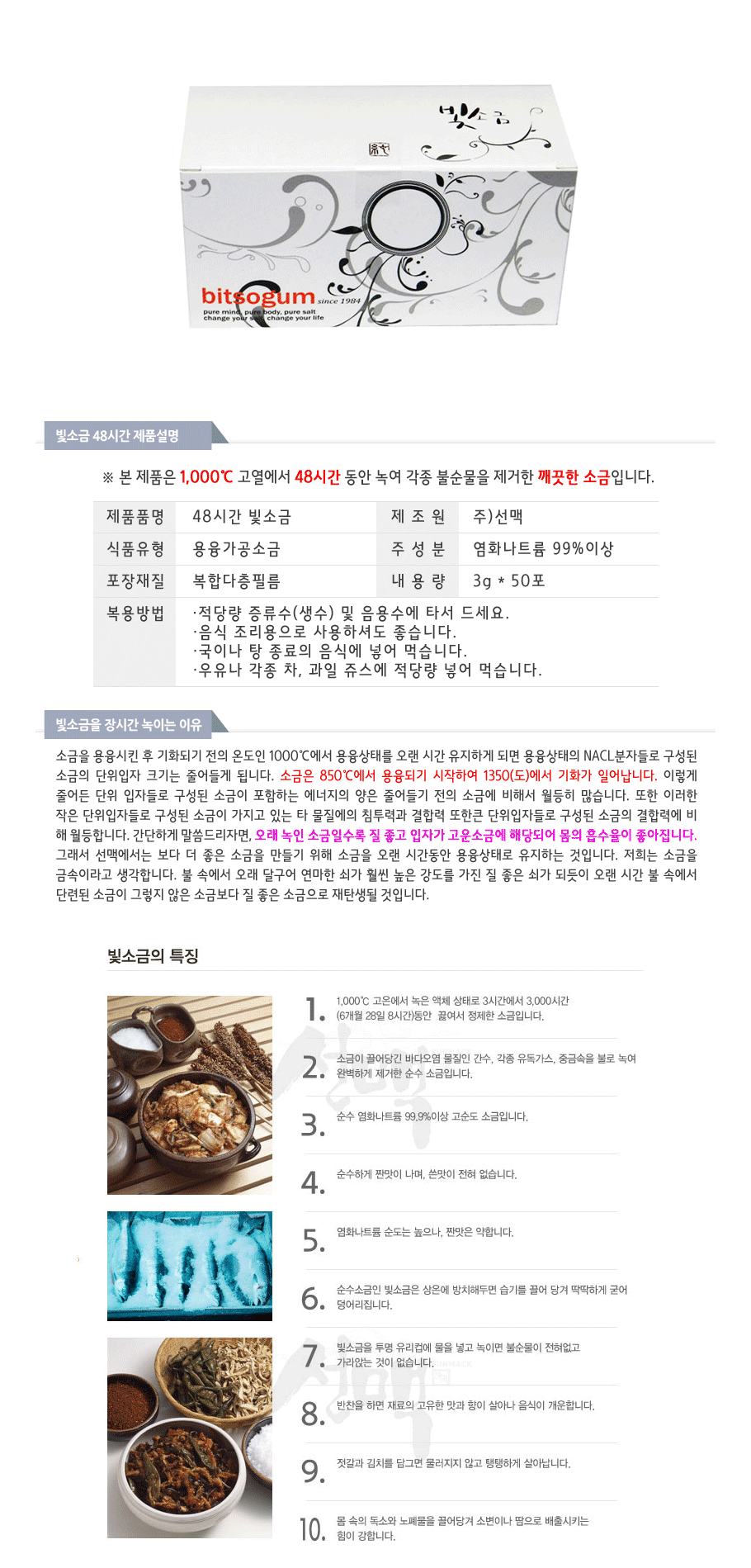 : 본 제품은 1,000도씨 고열에서 48시간 동안 녹여 각종 불순물을 제거한 깨끗한 소금입니다.