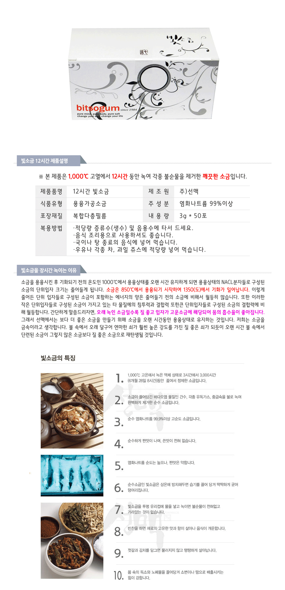 : 본 제품은 1,000도씨 고열에서 12시간 동안 녹여 각종 불순물을 제거한 깨끗한 소금입니다.