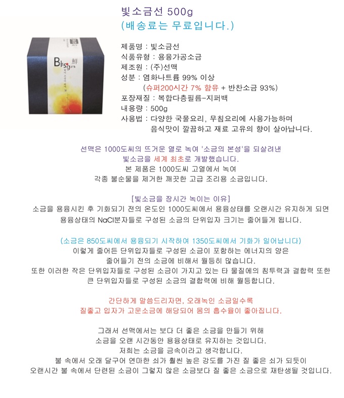 : 본 제품은 1,000도씨 고열에서 녹여 각종 불순물을 제거한 깨끗한 고급 조리용 소금입니다.